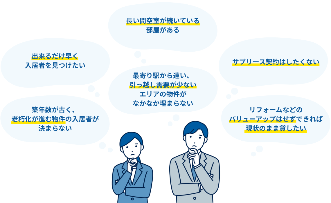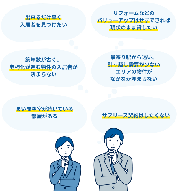 物件の広告掲載、入居者の選定、家賃の回収、物件のメンテナンス、入居者からのご要望・クレーム対応まで、 幅広くお任せいただけます。